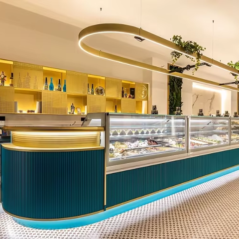 דלפק מאפייה מקצועי מותאם אישית עבור גלידת קפה קינוח עם תאורה led לעיצוב חנות ירוקה טרי